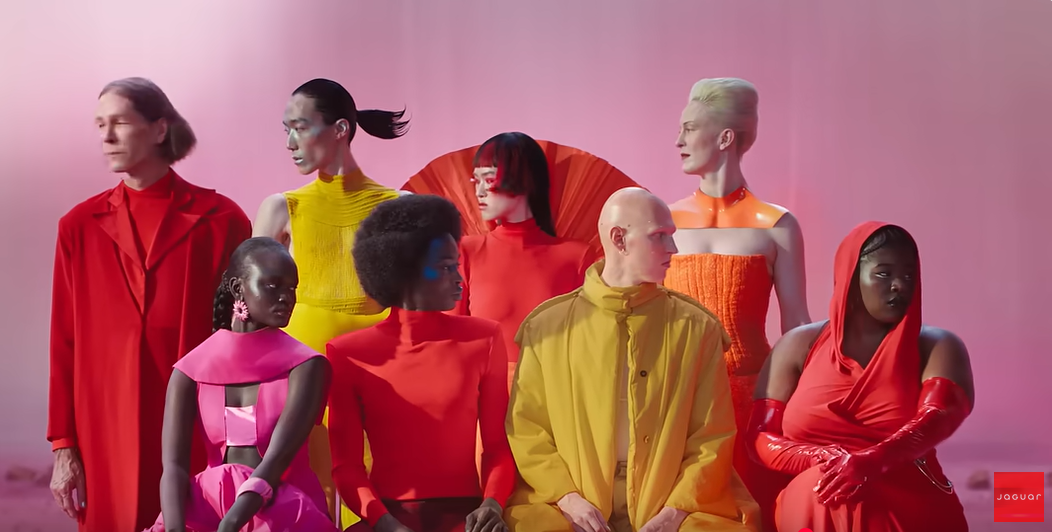 The video advertisement is presented more like a fashion ad than a car commercial and includes several human models dressed in lavish clothing and vibrant colors. There are no cars featured in the advertisement, only the models against a futuristic background with one model holding a paintbrush and another shown with a sledgehammer. The ad is edited to the pace of electronic background music and incorporates the phrases, “Create Exuberant,” “Live Vivid,” “Delete Ordinary,” “Break Moulds,” and “Copy Nothing.” The ad was created by Jaguar’s internal creative team rather than an external advertising agency. Two weeks after the video was released, Chief Creative Officer, Gerry McGovern, unveiled the new design concept for the Jaguar Type 00 car at Miami Art Week and doubled down on support for the new ad campaign and used a phrase from the video in a statement to the audience, “Be brave, be fearless, copy nothing.” During the presentation, he recalls a brief he had given to his creative team and having told them, “Create new objects of desire,” which he then boasts to the audience, were his exact words.